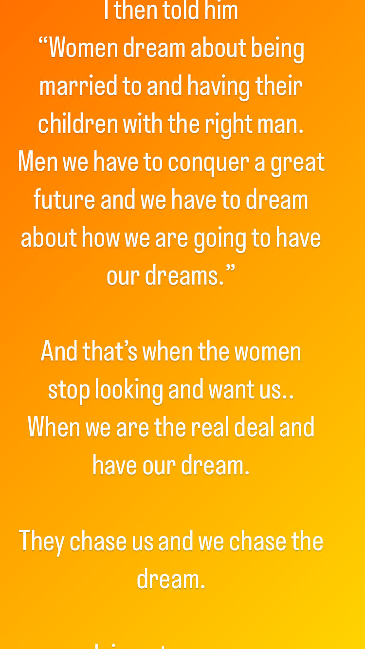 Or like the older players used to say when I was coming up is the man is the head and the women is the body. The man is the thought, the woman is his sound.